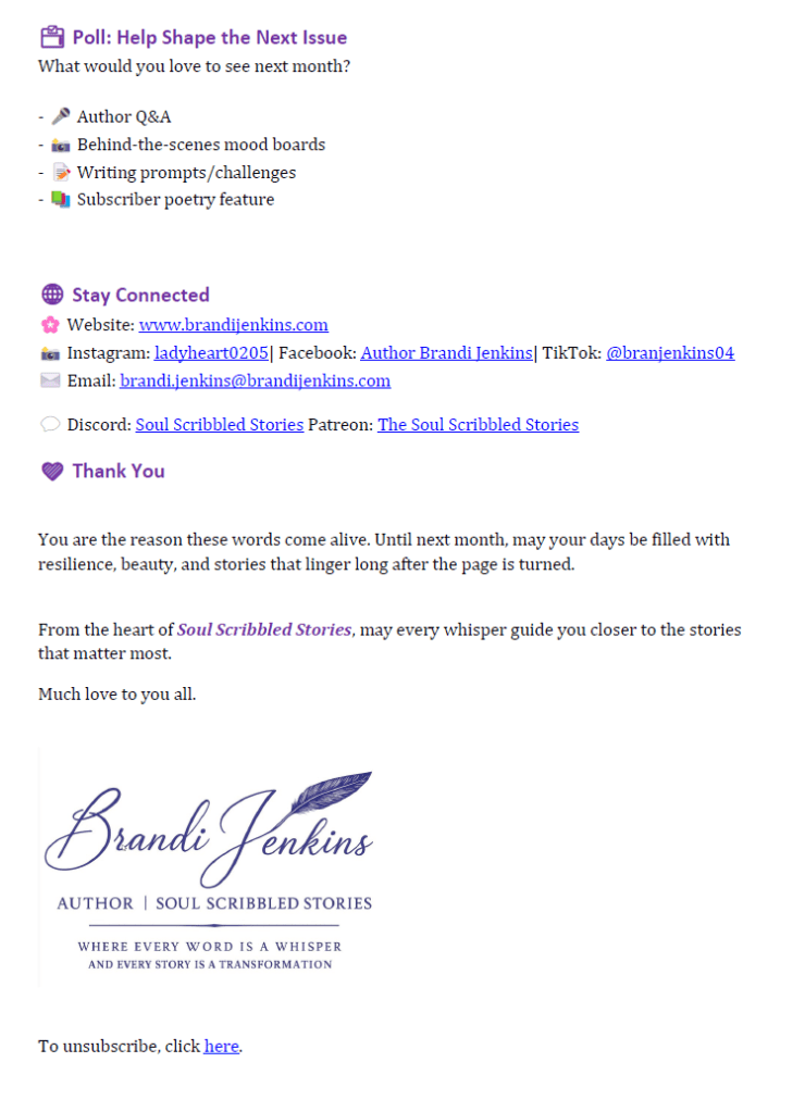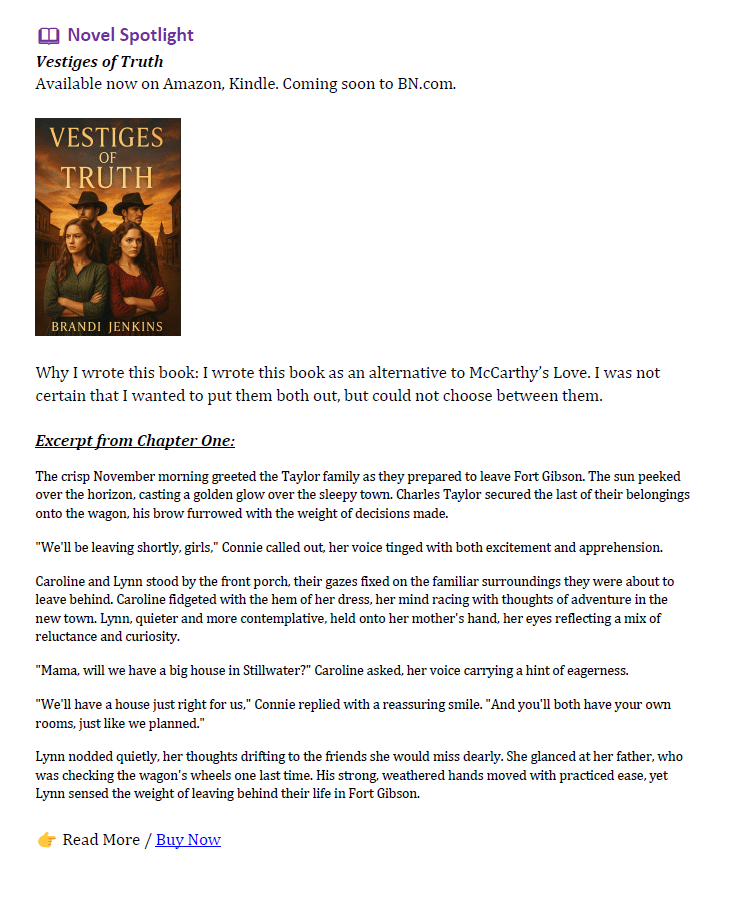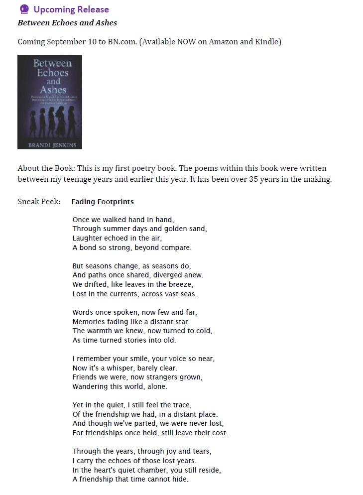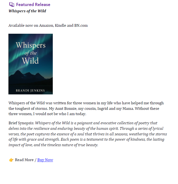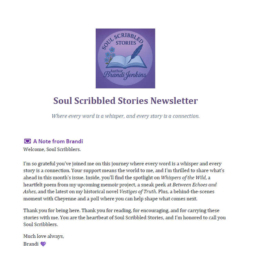 From soulful poetry collections, captivating historical romances, and everything in between, Brandi creates stories that echo with authenticity and lyrical grace. Each work invites readers to reflect, connect, and embrace the profound beauty in life's simplest moments.